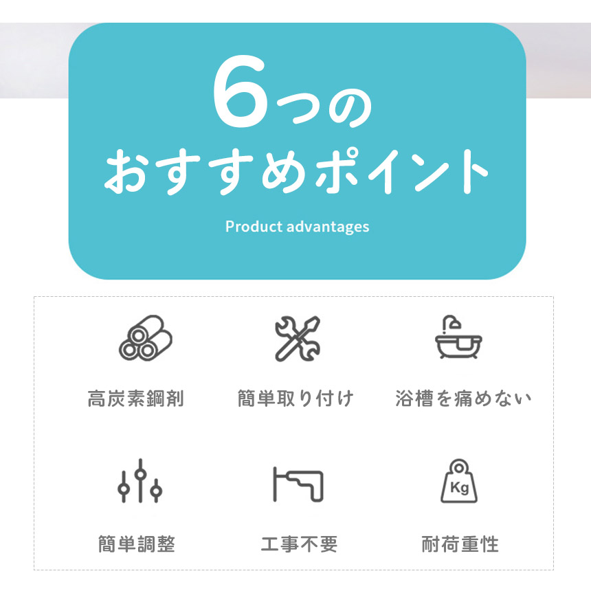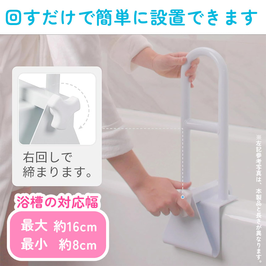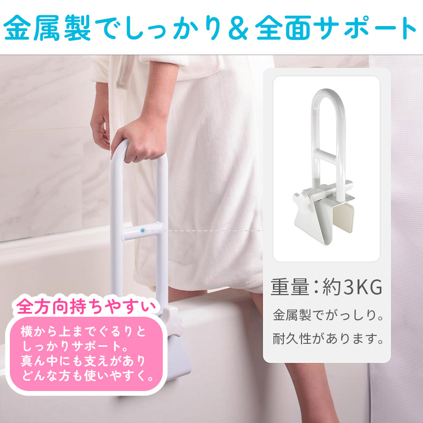〇浴槽に簡単取り付けの頑丈な手すり〇約3kgの金属でしっかりしていながら、工事や難しい手順も不要、回すだけで簡単取り付けできます。ラウンド状で全体がつかむことができ、間にも一本持ち手があり、どんな体勢でも持ちやすくなっています。腰痛や怪我、妊娠やご高齢などの理由で立ち上がりが困難な方、小さいお子様がいる方におすすめの商品です。