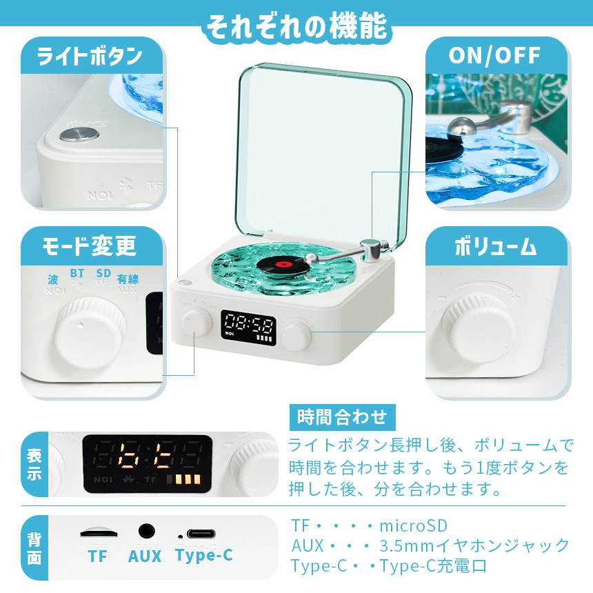Bluetooth、AUX(3.5mmジャック)、microSD、波音と選べます。