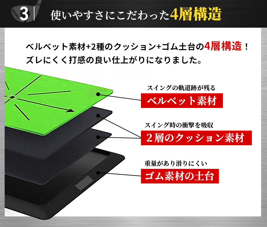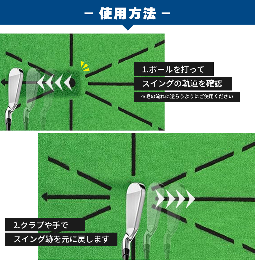 打ったあとは手やクラブでサッと毛並みを戻すだけで、何度でも繰り返し使用できます。