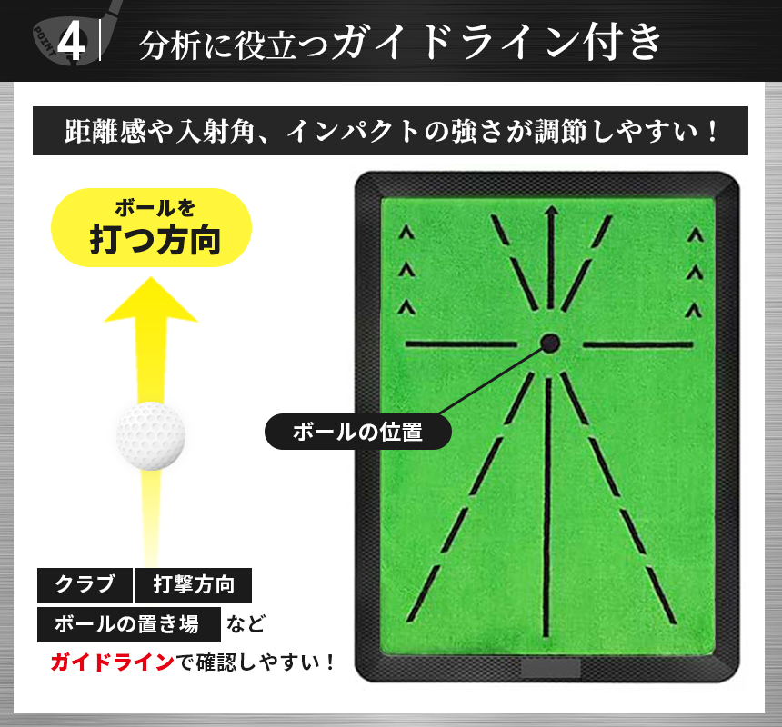 打球方向・クラブ軌道・ボールの位置を確認しやすいガイドライン入り。