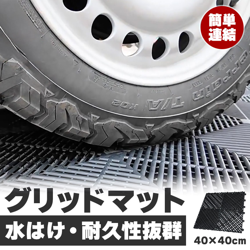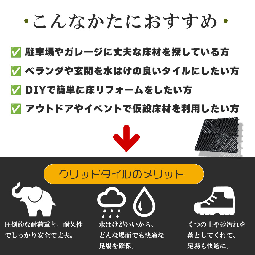 グリッドタイルは、耐久性に優れた樹脂製の連結式タイルです。1枚ごとに簡単に組み合わせが可能で、設置や取り外しがとても簡単!駐車場、ガレージ、ベランダ、玄関、プールサイドなど、多用途にお使いいただけます。