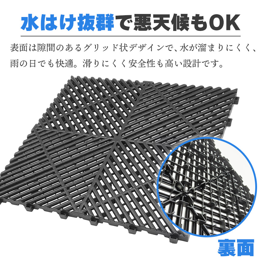 ・表面は隙間のあるグリッド状デザインで、水が溜まりにくく、雨の日でも快適。滑りにくく安全性も高い設計です。