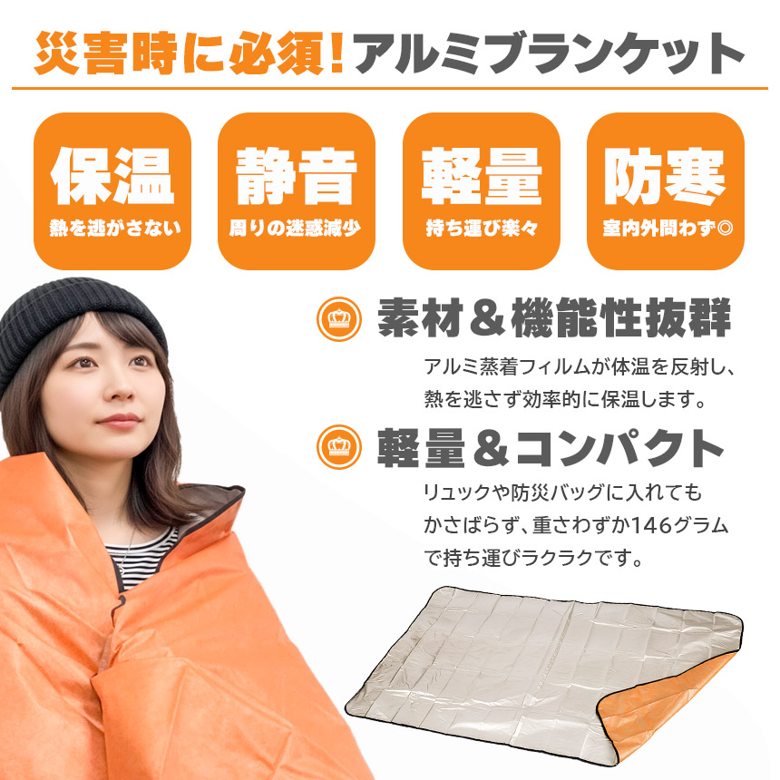アルミブランケット アルミシート 防災 保温 シート 180×105cm 簡易毛布 不織布付き 静音仕様 かさかさ サバイバルシート アルミ毛布 緊急用 防災グッズ アウトドア 車中泊 キャンプ 避難用 保温毛布 保温 静音 アルミシート 補助寝具 避難所 登山 断熱 防寒