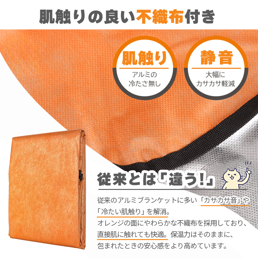 ・従来のアルミブランケットに多い「カサカサ音」や「冷たい肌触り」を軽減。