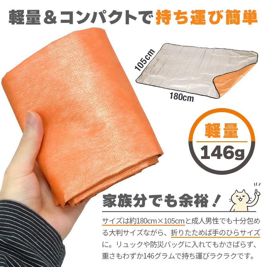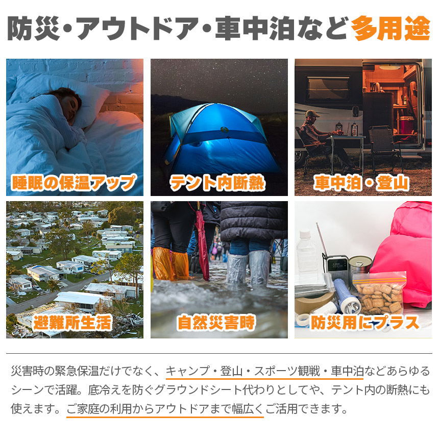 ・災害時の緊急保温だけでなく、キャンプ・登山・スポーツ観戦・車中泊などあらゆるシーンで活躍。