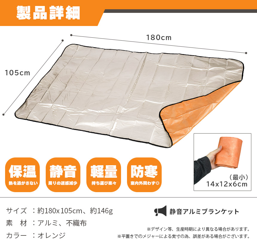 ・不織布のやさしい肌触りと静音性を備えた高品質アルミブランケット。