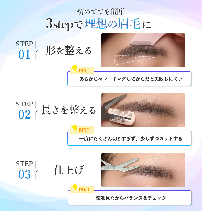 コームが毛流れを整えつつ、はみ出した毛だけをキャッチ。余分な毛だけを少しずつカットできるので、失敗の原因「切りすぎ」をしっかり防ぎます。初めてのセルフケアでも自然で均一な仕上がりに。