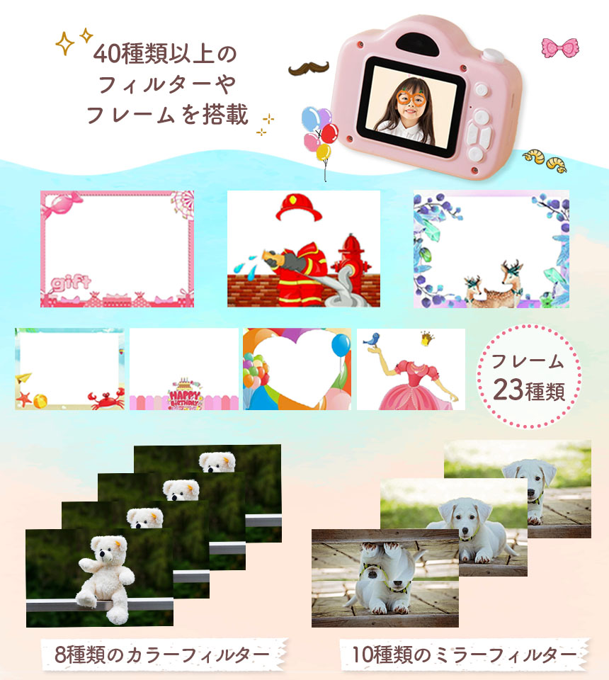 動物・花・ハート・レトロ風など、シーンに合わせて楽しく撮影できます。