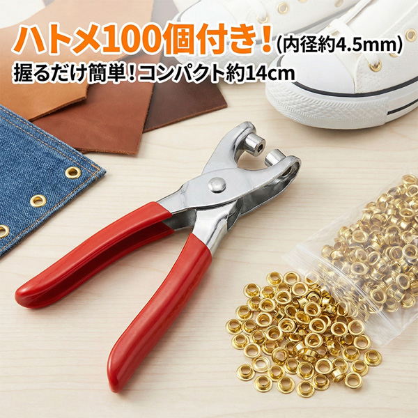ハトメパンチ 4.5mm ハトメ 100個付 ハトメプライヤー 鳩目 穴あけ カシメ 工具 DIY レザークラフト 手芸 ベルト 靴 補修 アイレット プライヤー ハンドメイド 小型 14cm セット