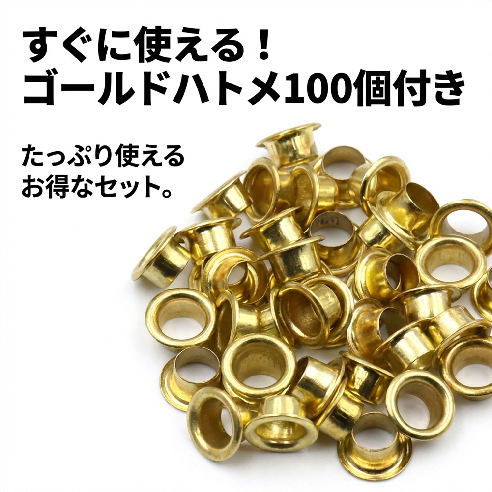 ハトメ玉が約100個付属しているので、届いたその日からすぐに、たっぷりと作業していただけます。