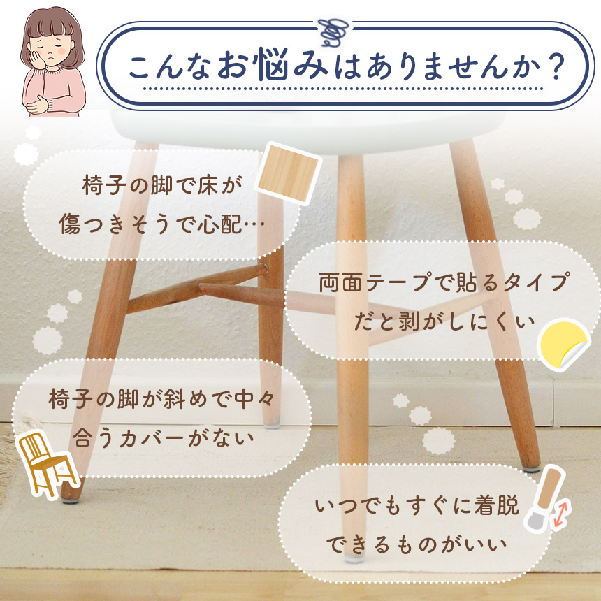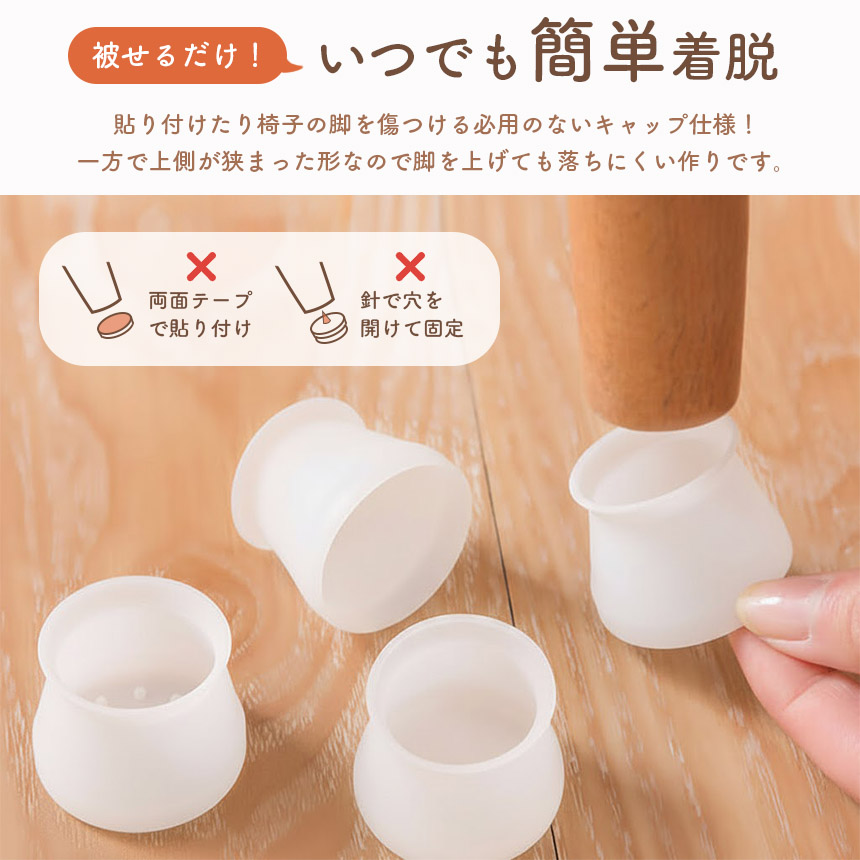 椅子やテーブルの脚に着けて床への傷を防止・動かす時の防音・滑り止めにもなるカバーです!