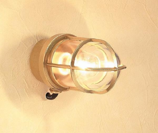 玄関先などの軒下の空間向きのブラケット型のマリンライトです。 灯台のライトハウスをモチーフとした傘や、セードの保護金具がマリン調の雰囲気を醸し出しています。 |
