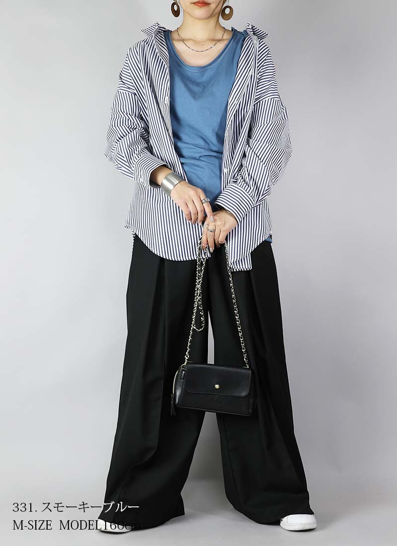 【M】肩〜腕まわりにかけてぴったりフィット。身幅はややゆとりあり。【L】ゆとりのある着心地◎おしりがすっぽり隠れました。