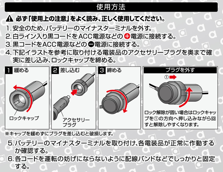 レーダー探知機やドラレコ等シガープラグ製品の電源裏取りに。振動による脱落を防止するロック付き。