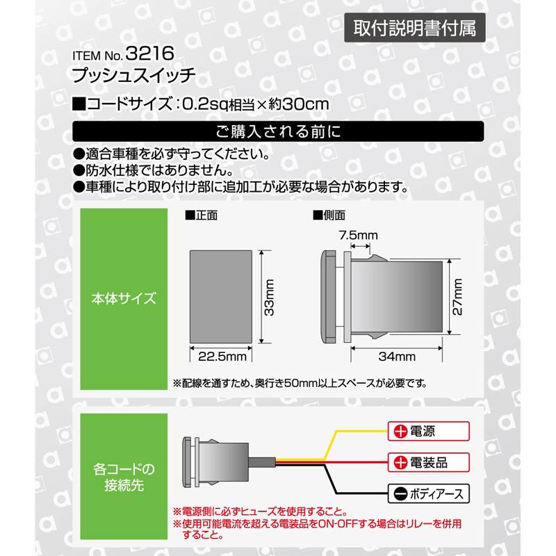 | 空きスイッチパネルとそのまま交換できる純正風ON-OFFスイッチ ON-OFFに連動してスイッチの電源マークの明るさが変わる 接続方法により常時照光とON時照光の切替が可能 トヨタ車用 【仕様】 ●スイッチタイプ:ON⇔OFF ●使用可能電力::DC12V車専用/500mA以下 ●コード:0.2sq相当-30cm ●LED発光色:白色 【内容物】 ●プッシュスイッチ:1個 ※画像はイメージです。実際の商品とは異なる場合がございます。 ※パッケージにつきましては、メーカーの仕様変更等により予告なく変更になる場合がございます。パッケージの違いによる返品・交換は承っておりませんので予めご了承ください。 | |