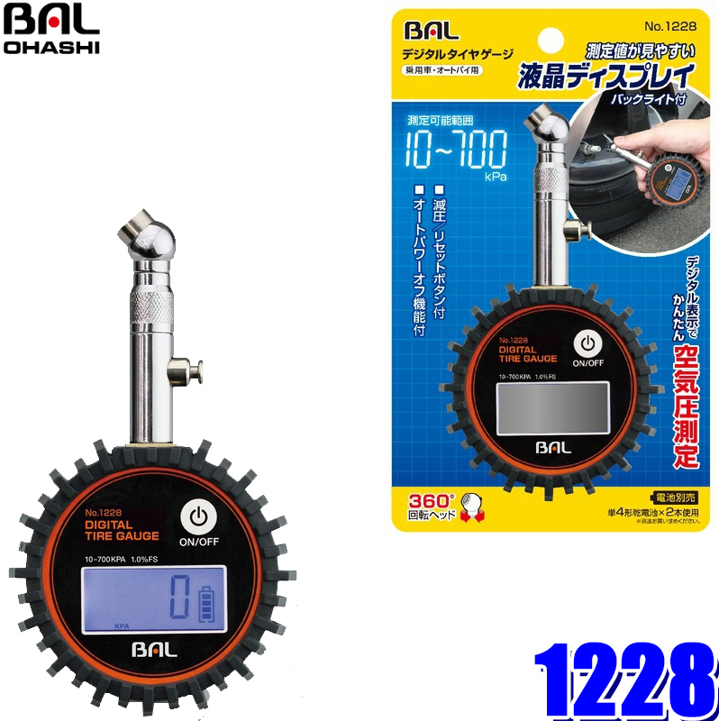 1228 大橋産業 BAL デジタルタイヤゲージ 測定可能範囲10〜700kPa 測定精度1.0%FS