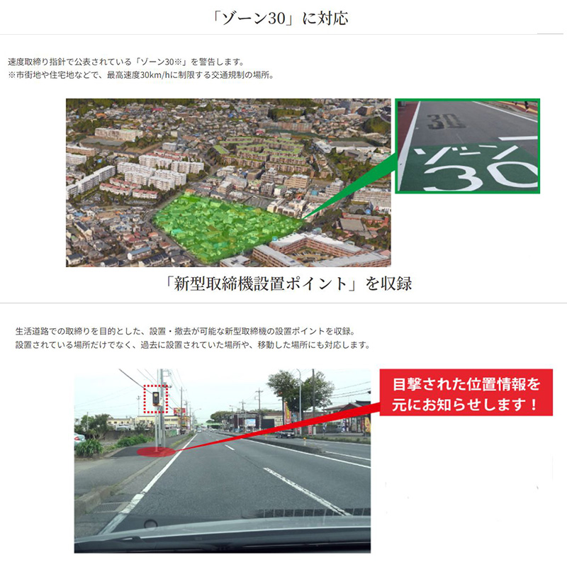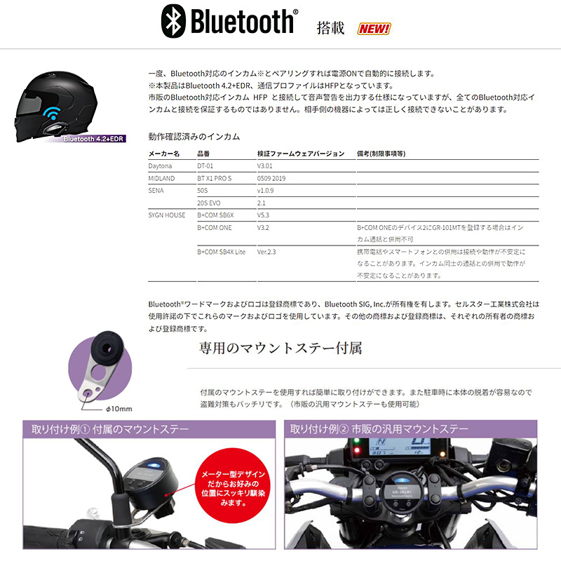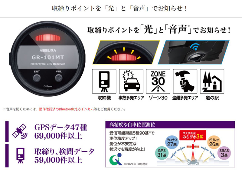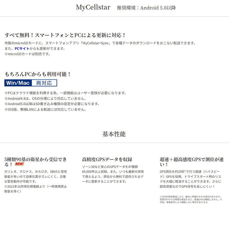 | 【付属品】 直結配線DCコード/マウントステー/取扱説明書 ■取り付けについて ●直結配線DCコードの車両への取り付けには専門的な知識を必要とします。 ●本体の設置場所、配線は運転に支障がないか走行テストをおこなってください。取り付けによる事故に関し、一切の責任を負いかねます。 ●長期間車両を使用しない場合は、本機を取り外してください。 ●走行中に本機を操作したり、LEDランプを注視しないでください。 ■本製品の防水・防塵について ●本製品は、IP66等級相当の防水・防塵性能がありますが、激しい雨や洗車などでは本体を取り外し、直結配線DCコードのキャップをしめ、防水対策をおこなってください。また、直結配線DCコードのヒューズボックス側は、防水仕様ではありません。 ●microSDカードスロットのキャップを確実にはめこみ、防水・防塵対策をおこなってください。本体内に浸水したり、ほこりやゴミなどの異物が混入し、故障の原因となります。 ●耐振動(振動加速度試験)は8Gクリアしました。*JIS C 60068-2-6に準ずる。 ■Bluetoothについて ●本製品はBluetooth4.2+EDR、通信プロファイルはHFPとなっています。市販のBluetooth対応インカム(HFP)と接続して音声警告を出力する仕様になっていますが、全てのBluetooth対応インカムと接続を保証するものではありません。相手側の機器によっては正しく接続できないことがあります。 ●通信環境、周囲の状況によっては、雑音が入ったり、音が途切れたりすることがあります。 ●Bluetoothの特性により、音声がわずかに遅れることがあります。 ■各種GPS警告について ●取締りポイントおよび待伏せエリアは、取締りの目撃情報を基に登録されています。 ■各種警告案内について ●本製品でお知らせする制限速度は、天候、その他による臨時規制や時間帯で変化する速度規制には対応していません。 ●制限速度切替りポイントは、インターチェンジやジャンクションなどの接続部や料金所などによる制限速度の切替りはお知らせしません。 ●トンネル案内は、都市高速(首都高速、阪神高速など)では案内しません。 ■MyCellstar for Androidについて ●スマートフォンは、メモリー状況、使用環境など様々な要因によりアプリが正常に動作しない場合があります。 ■MyCellstarについて ●MyCellstarでGPSデータのダウンロードは、インターネットへの接続が可能な環境とmicroSDカードを読み書きできるパソコンが必要となります。詳しくは、メーカーホームページをご参照ください。 ●本サービスは予告なく終了させていただくことがあります。あらかじめご了承ください。 ■アイドリングストップ車での使用について ●一部のアイドリングストップ車では、再始動時に電源確保のため各部分への供給電圧が低下することがあります。これにより本体の電源が落ちる場合があります。 ■その他の注意について ●本製品は日本国内仕様です。海外ではご使用にならないでください。 ●製品のデザインや仕様は、改良等のため予告なく変更する場合があります。 ●本製品に搭載されているコンテンツは、個人として使用するほかは、著作権法上、権利者に無断で使用できません。 ■掲載の写真はイメージで、実際には必要な配線を省略しているものもあります。 ●本製品の誤った取扱いによる車両や車載品などの事故・破損・故障・損害等が発生しましても一切の責任を負いかねます。また保証なども一切ありません。 ●本製品は、安全運転を促進する目的で製造販売されています。くれぐれも、速度の出し過ぎや飲酒運転は絶対におやめください。また、緊急車両が接近した際には速やかに道をお譲りください。 ※画像はイメージです。実際の商品とは異なる場合がございます。 ※パッケージにつきましては、メーカーの仕様変更等により予告なく変更になる場合がございます。パッケージの違いによる返品・交換は承っておりませんので予めご了承ください。 | |