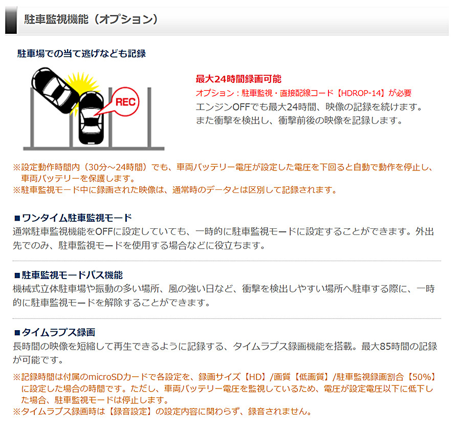 | 【付属品】 シガープラグコード(4m)/取付ステー固定用両面テープ/コードクランプ/脱脂クリーナー/ステッカー【HDROP-06】/microSDカード(32GB/class10) 【オプション】 駐車監視・直接配線コード:HDROP-14 直接配線コード:HDROP-15 ドライブレコーダー相互通信ケーブル(長さ約4m):ZR-13 ドライブレコーダー相互通信ケーブル(長さ約0.4m):ZR-14 ドライブレコーダー相互通信ケーブル(長さ約8m):ZR-17 AVケーブル:HDROP-10 【ご購入時の注意】 ●本製品にはお買い上げの日から3年間の製品保証がついています。(ただしmicroSDカード、両面テープ等の消耗品は保証の対象となりません) ●ダッシュボード上へ取付ける場合は、道路運送車両法に基づく保安基準に適合させるため、運転や視界の妨げにならない場所に取付けてください。 ●リヤガラスにラジオアンテナが貼られている車両の場合、リヤへの取付けは行わないでください。 ●LED式信号機はLEDが高速で点滅している為、信号機が点滅しているような映像が記録される場合があります。また逆光や信号機自体の輝度が低い等、信号機の色が識別できない場合があります。そのような場合は、信号機通過前および通過後の映像、周辺の車両状況から判断してください。信号の識別、記録に関する内容について、一切の責任を負いかねますのでご了承ください。 ●本製品使用時は必ず付属のmicroSDカードを使用してください。付属品以外のmicroSDカードとの相性による動作不良について一切の責任を負いかねます。 ●本製品は全ての映像を記録することを保証するものではありません。あらかじめご了承ください。 ●本製品は使用方法によりプライバシーなどの権利を侵害する恐れがありますのでご注意ください。またイタズラなどの目的で使用しないでください。これらの場合について、一切の責任を負いかねます。 ●シガープラグコードで接続したレーダー探知機と相互通信接続して使用している場合、一部アイドリングストップ車でエンジン再始動時に本体が再起動する場合があります。その場合、付属のシガープラグコードもしくはオプションHDROP-14/15のいずれかを接続することでアイドリングストップ車でも再起動しなくなります。 ●本製品はDC12V/24V専用です。 | |