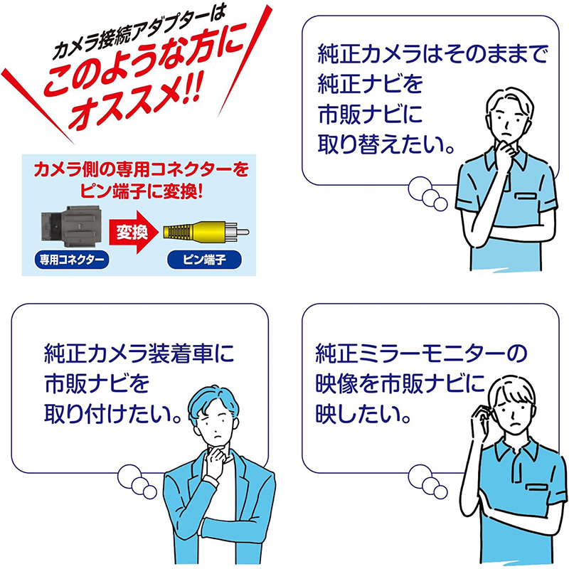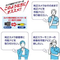 | 【同梱品】 ・カメラ接続アダプター ・小型切替スイッチ ・ギボシ端子&スリーブ(オス×各4、メス×各1) ・両面テープ(大×1、小×1) ・結束バンド ×5 ・取付/取扱説明書 ※純正部品のカメラコントローラーキット ( スズキ品番:99000-79CA1)、または(マツダ品番:Z9N1 V6 55Y)が必要です。ディーラー等でご用意ください。 ※本製品使用時は左右確認サポートの通知音が鳴りません。カメラ映像内のマーカー表示のみとなります。 ※適合情報については令和7年2月時点の情報となります。メーカーにて適合情報等が変更、更新される場合がございますので、必ずメーカーHPにて最新情報をご確認のうえお買い求めください。 ※画像はイメージです。実際の商品とは異なる場合がございます。 ※パッケージにつきましては、メーカーの仕様変更等により予告なく変更になる場合がございます。パッケージの違いによる返品・交換は承っておりませんので予めご了承ください。 | |||