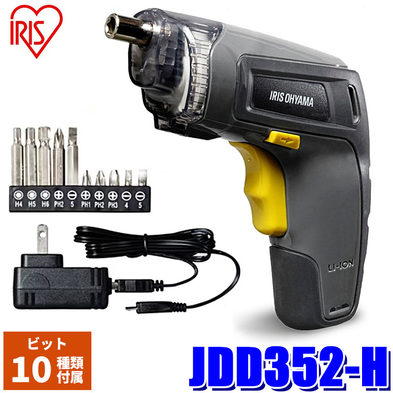 JDD352-H アイリスオーヤマ 充電式電動ドライバー 3.7V グレー/マスタード ビット10種類付属 最大締付トルク3.5N・m 電動工具 LEDライト付き
