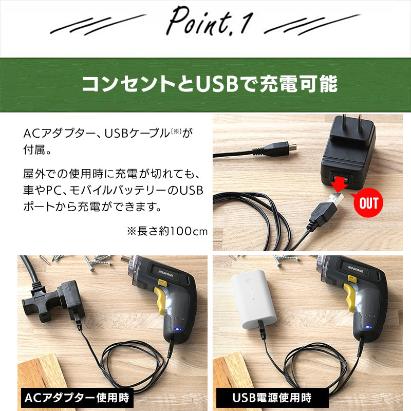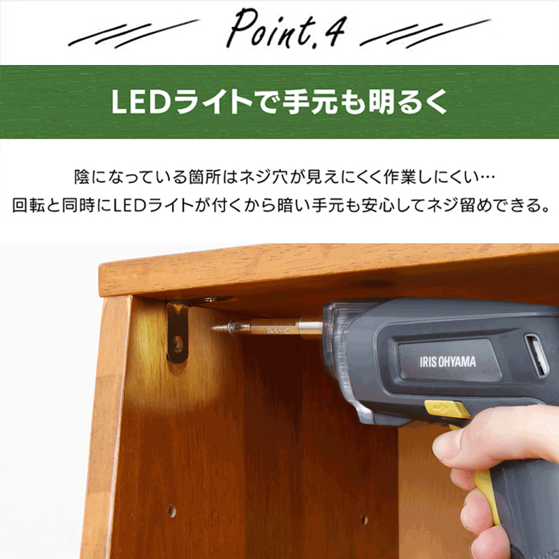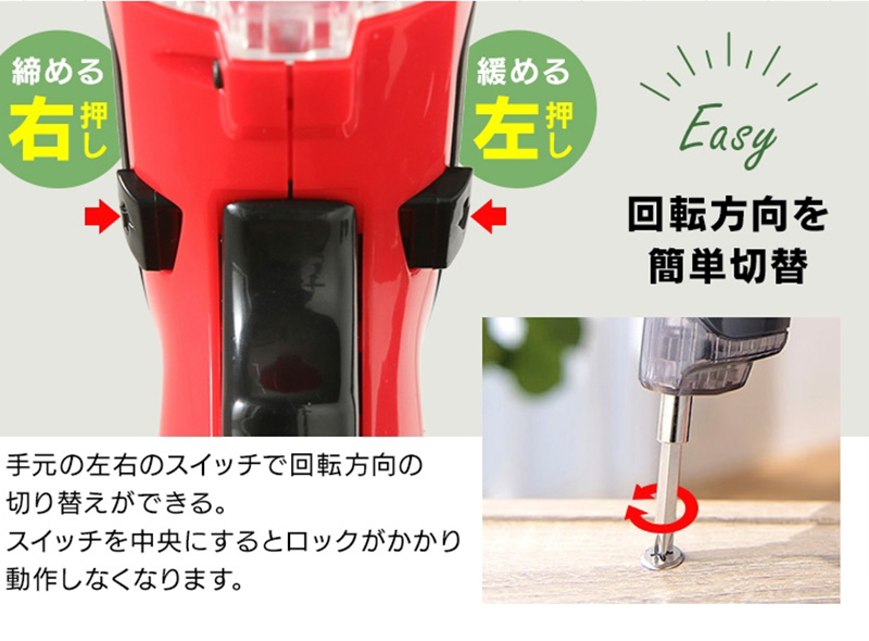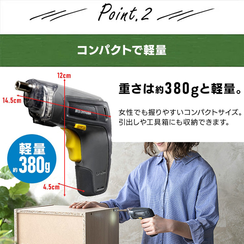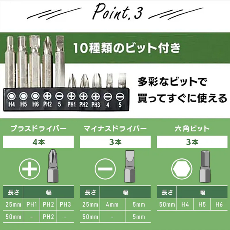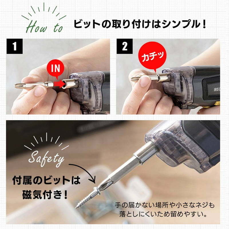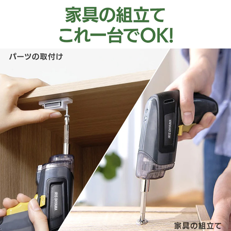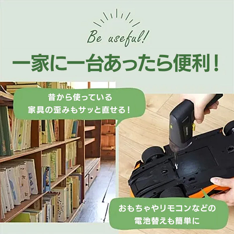 DIYや家具の組み立てに使いやすい軽量な充電式ドライバー。10種類のビット付きでおもちゃやリモコンなどの電池交換も簡単に!