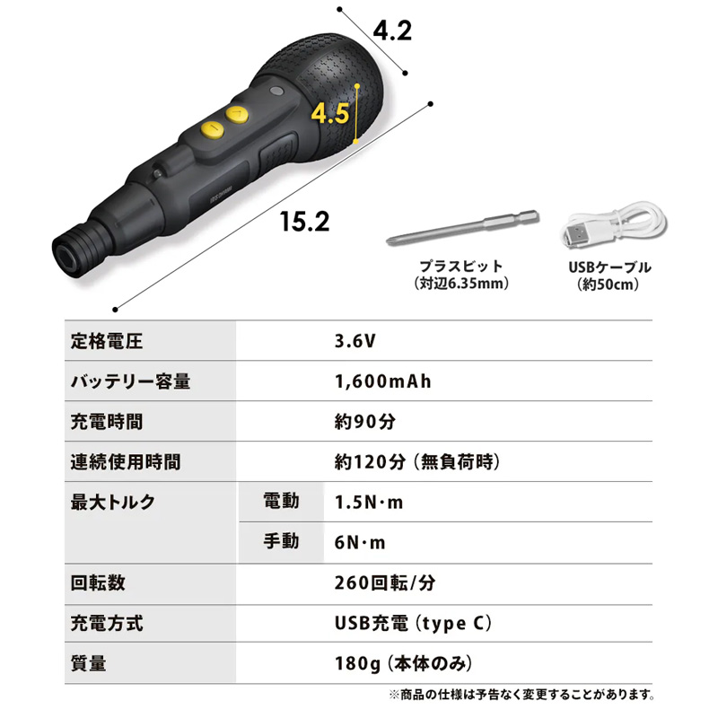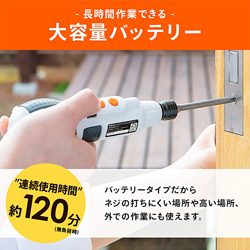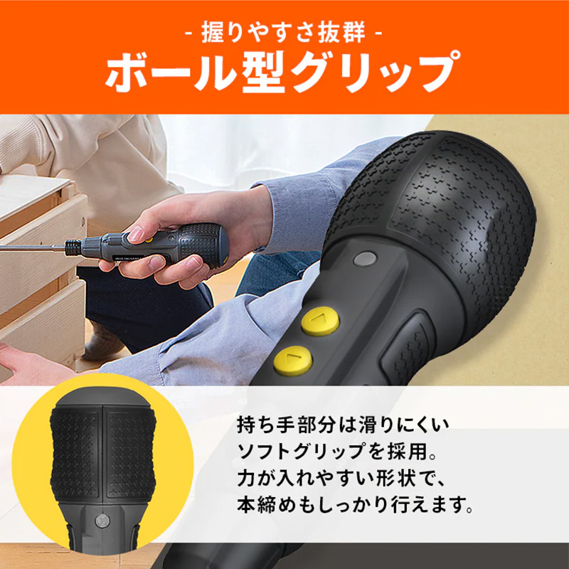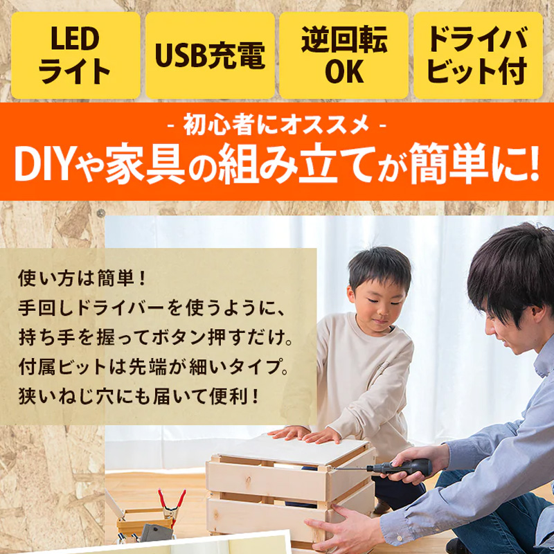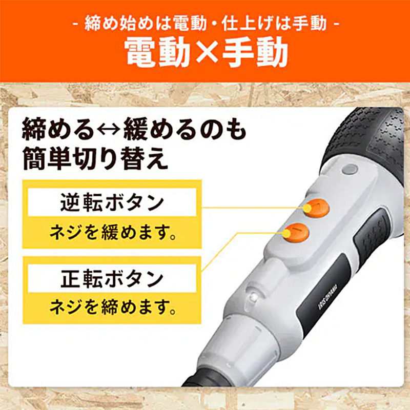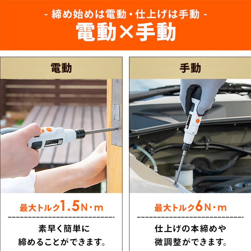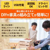 締め始めは電動で素早く、仕上げは手動でしっかりねじ締めが可能。家具の組み立てや初めてのDIYにも最適です。LEDライト付きで暗い箇所の作業にも。