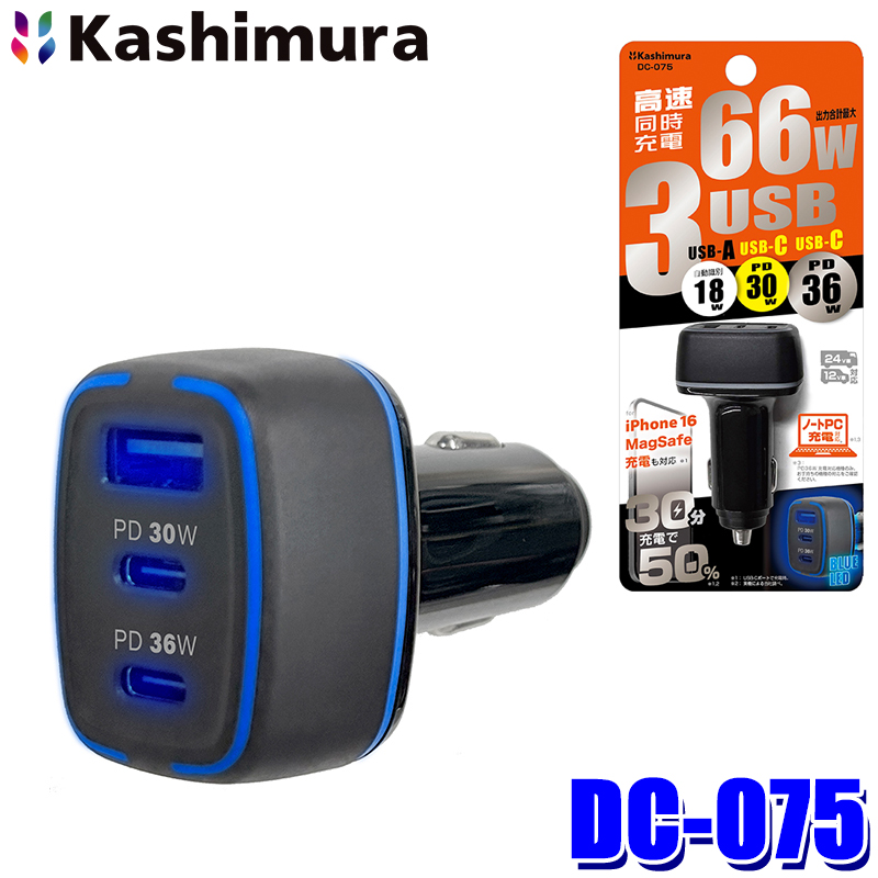 DC075 カシムラ Kashimura DC-60W USB3ポート C2A1 高速充電 PD規格対応 車載用USB電源 自動識別IC搭載 12V/24V車兼用 通電表示ブルーLED付