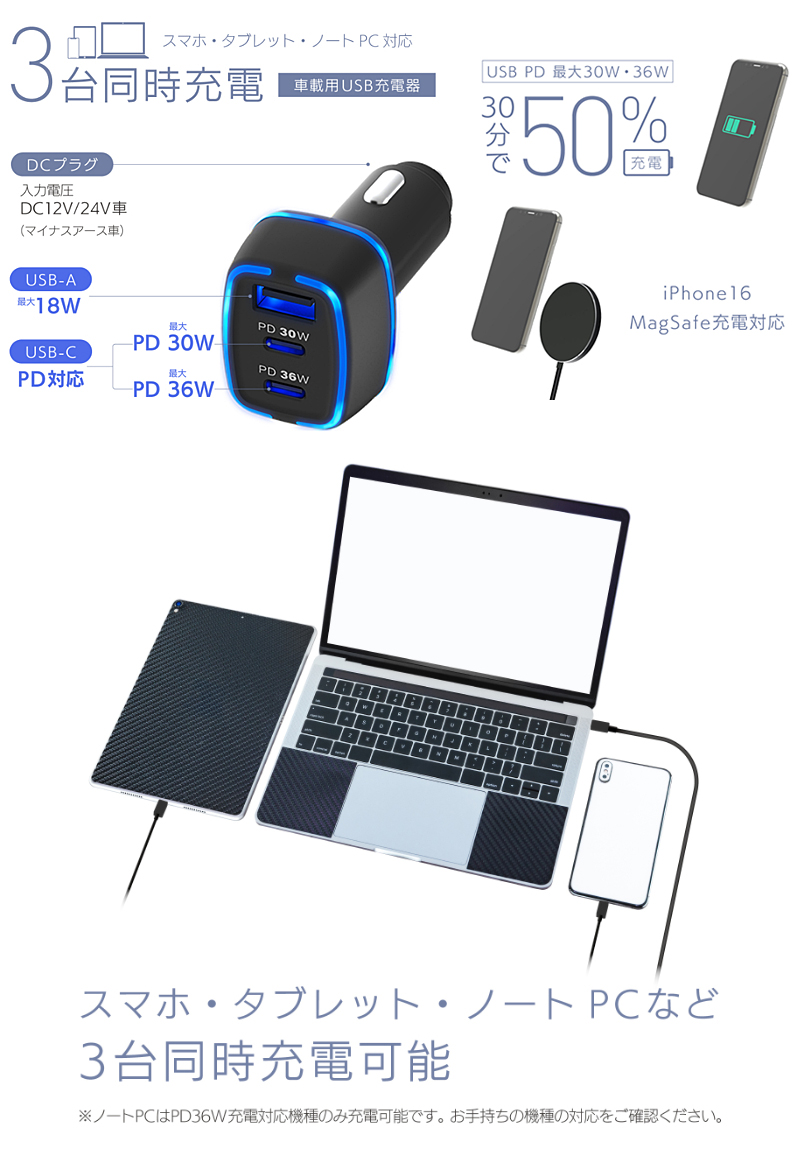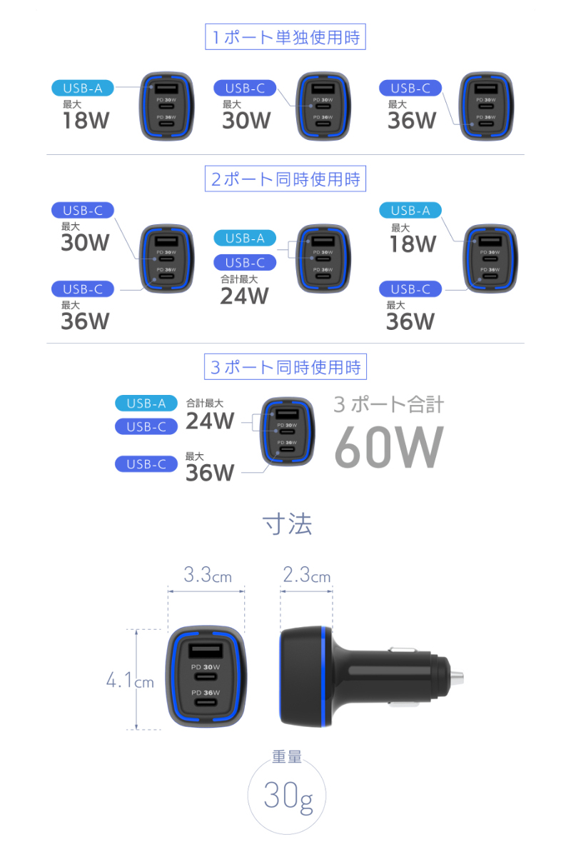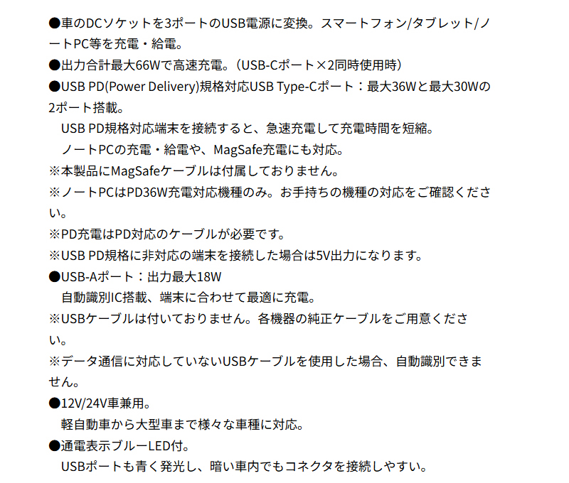 車のDCソケットを3ポートのUSB電源に変換。スマートフォン/タブレット/ノートPC等を充電・給電。PD規格対応USB、Type-Cポート最大36Wと最大30Wの2ポート搭載。