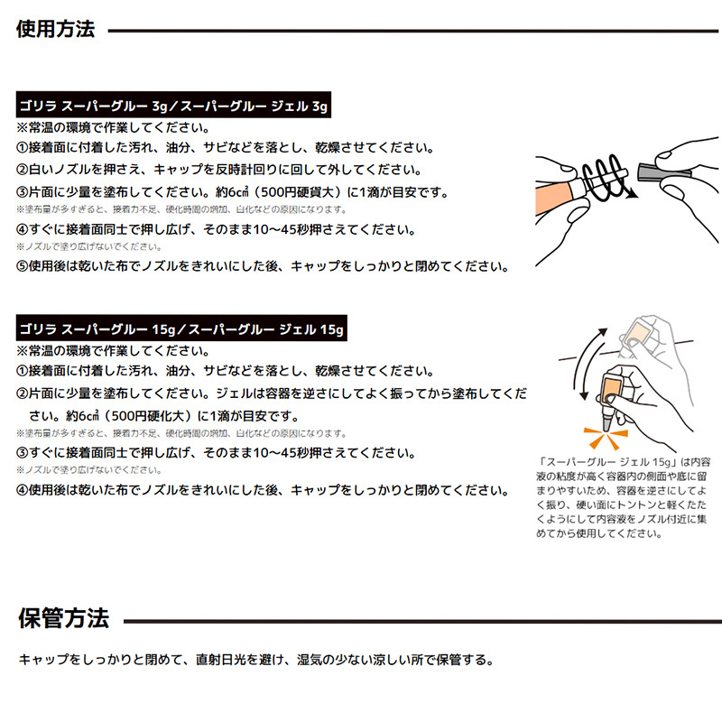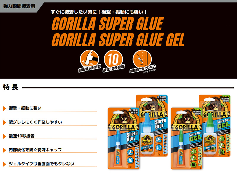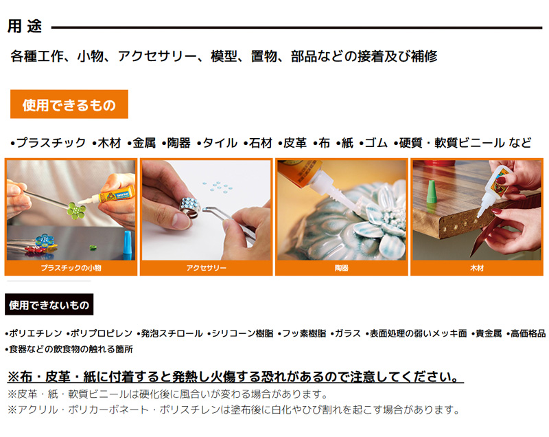 最速10秒で接着!粘度があるため液だれしにくく、作業性に優れています。工作、小物、アクセサリー、模型、置物、部品などの接着及び補修におすすめ。