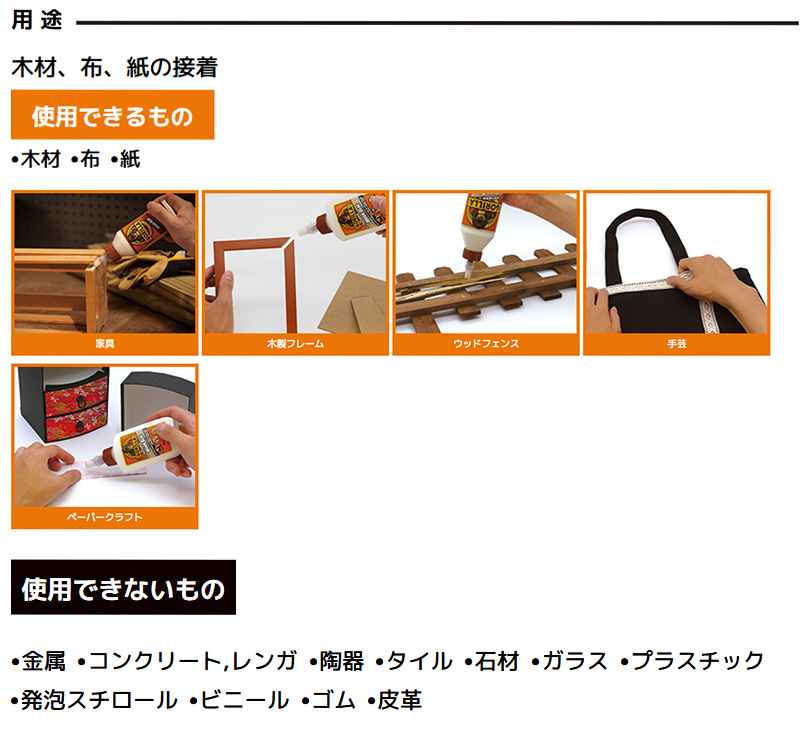 耐水性で屋内、屋外問わず使用できる木工用接着剤。硬化後は塗装・研磨・切削が可能です。