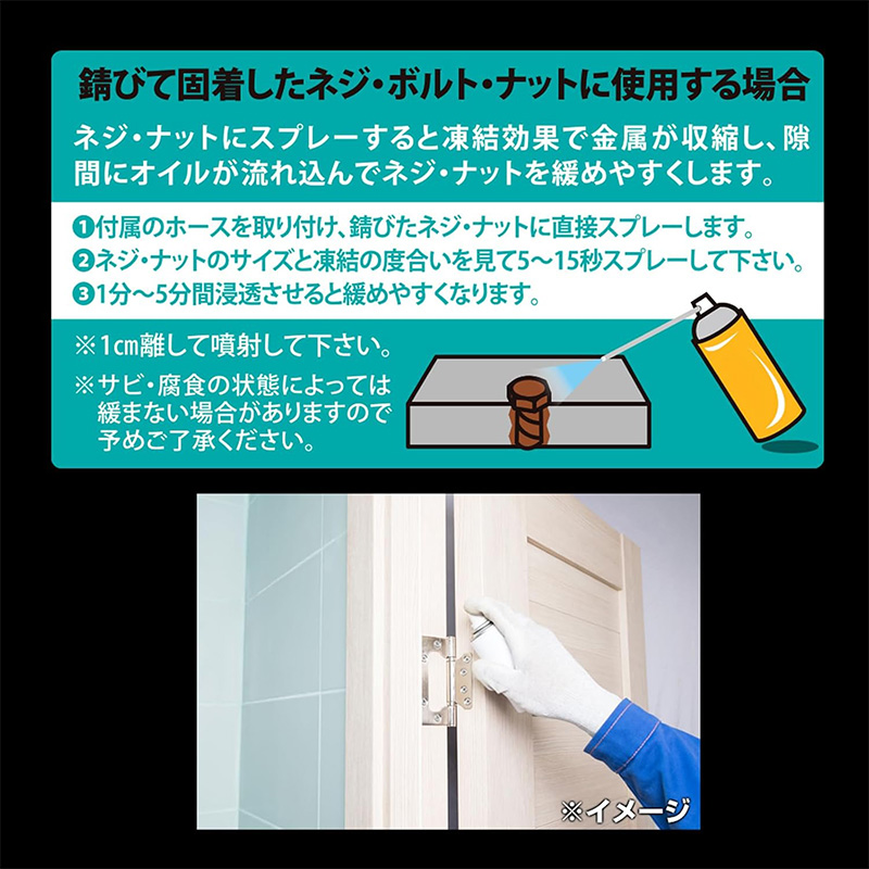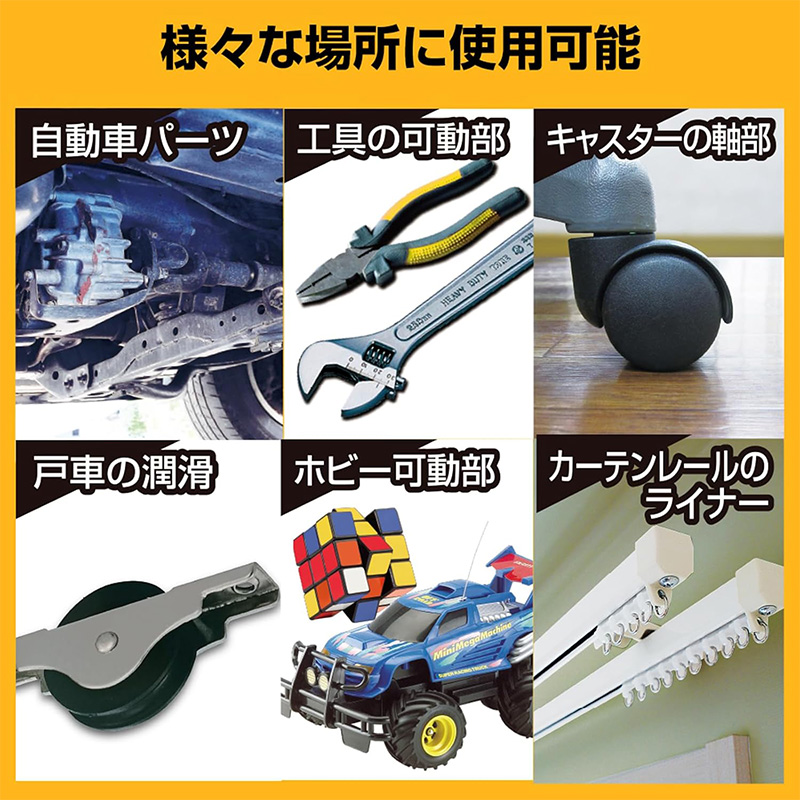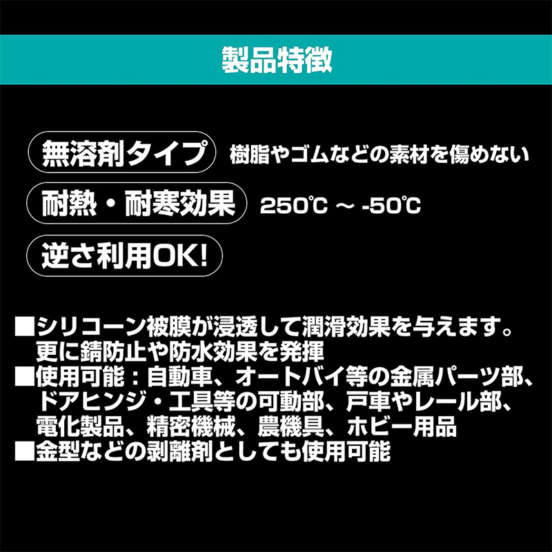 シリコーン被膜の潤滑・防錆効果により、自動車・オートバイ等の金属パーツ部・ドアヒンジ・戸車・ベアリング等、各部に浸透して動きをスムーズにし、錆を防止。