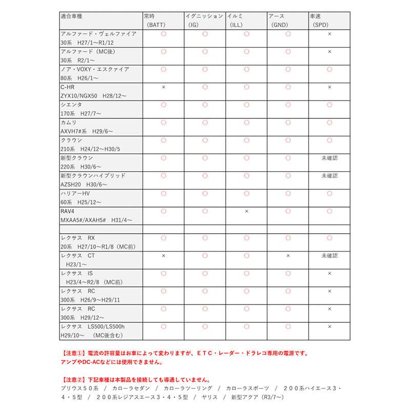 トヨタ車及びレクサス車両の運転席キックパネル付近にあるオプションコネクターからカプラーオンで電源を取り出すことのできるハーネスです。