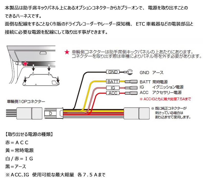 助手席キックパネル上にあるオプションコネクターからカプラーオンで、電源を取り出すことのできるハーネスです。