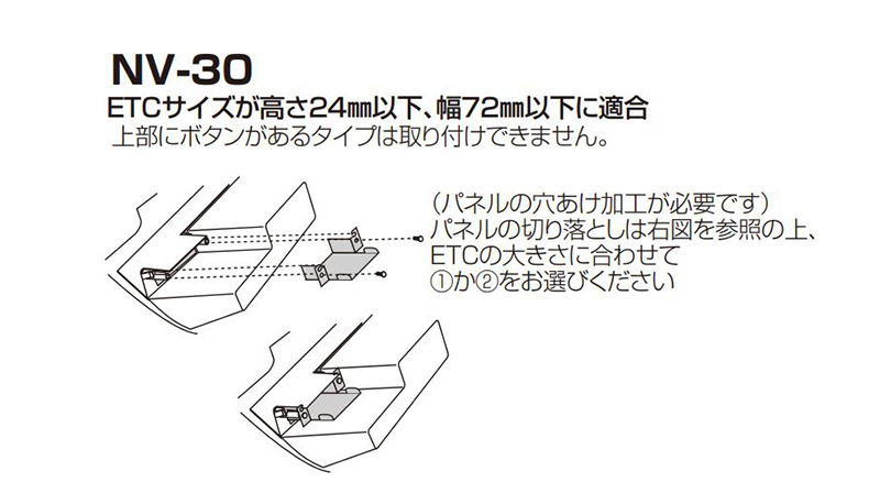 (ETC機器のサイズが高さ20mm、幅80mmを超えるもの、ETC機器の上部にボタンがあるタイプは取付できません。)