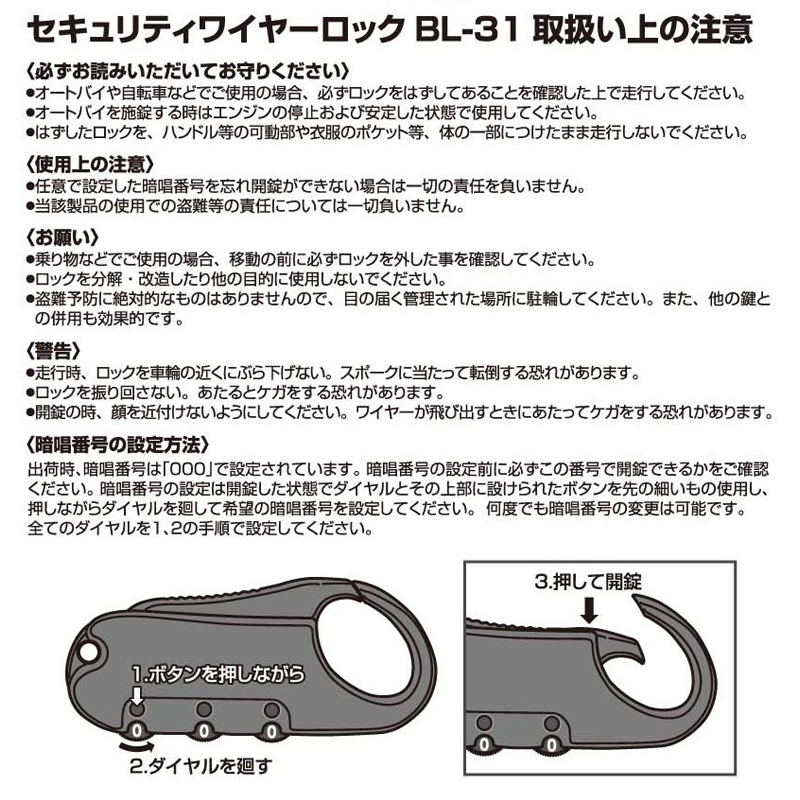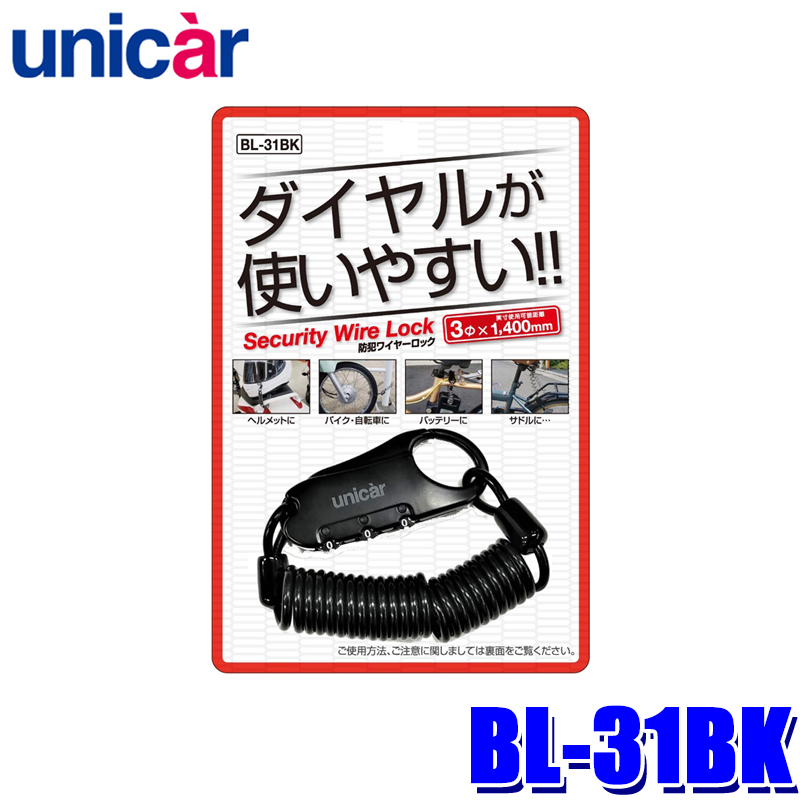 BL-31BK ユニカー工業 unicar セキュリティーワイヤーロック バイクロック ダイヤル式 コンパクト バイク用品 盗難防止 ワイヤー径3mm 長さ1400mm