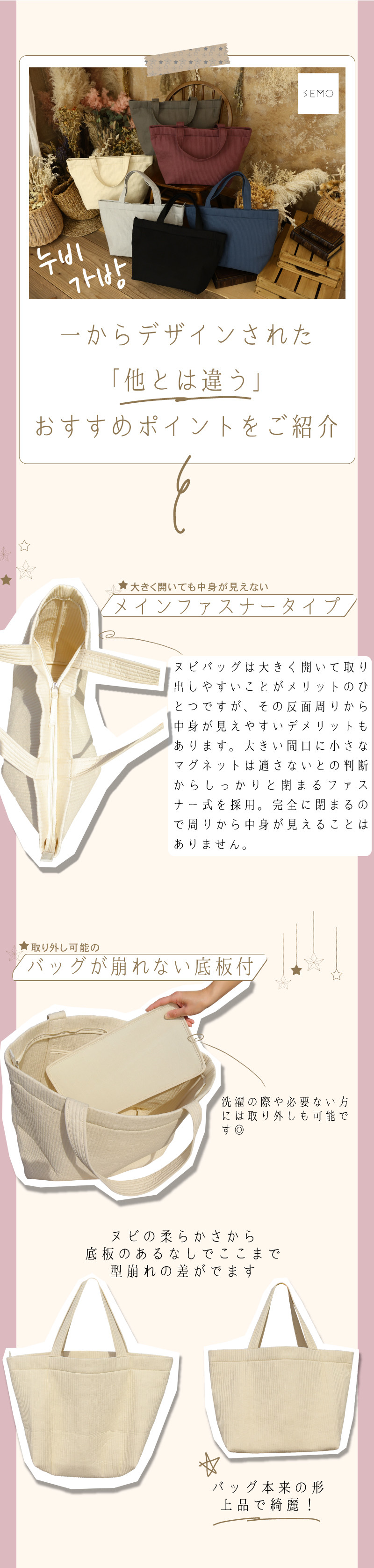 人気のイブル生地を使用し一から全てデザインした、シンプルでかわいいトート バッグです。イブルの布を使ったバッグはイブルバッグ、ヌビバッグと呼ばれていて、本場韓国でも人気の高いトートです。ヌビ バッグは凹凸のある キルティング素材なので、しわになりにくく、トートバッグをたたんで旅行などのサブバッグとしてもお使いいただけます。