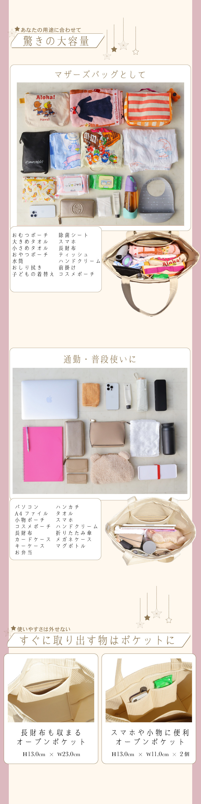 普段使いはもちろん、マザーズバッグ・エコバッグ・旅行用サブバッグとしても大活躍。保育園や幼稚園の荷物を入れて、また通学、通勤に、ママのおけいこバッグやレッスンバッグとしてもお使いいただけます。カジュアルからフェミニンまで、どんなスタイルにもマッチします。