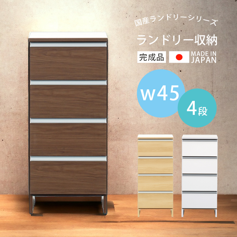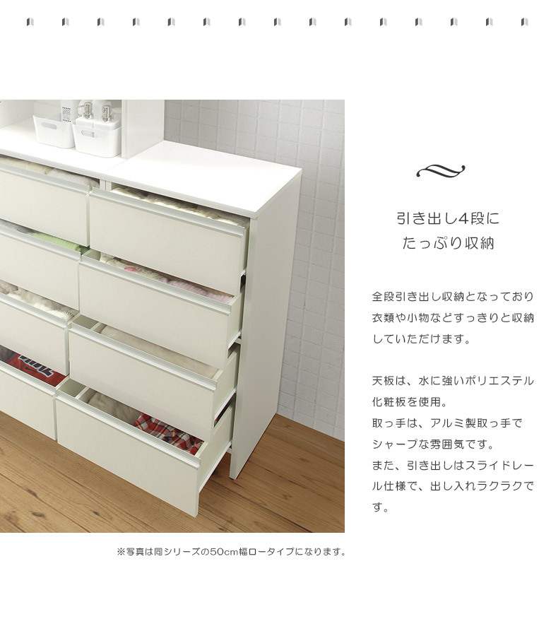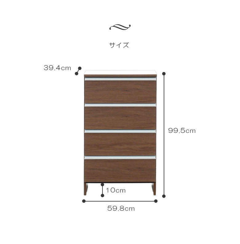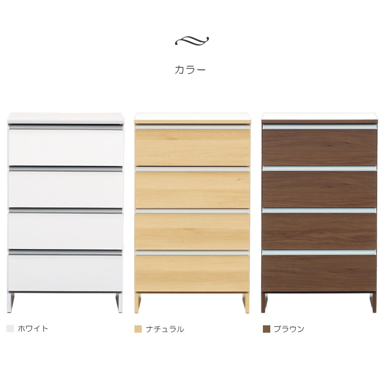 木目の2色と艶の美しいホワイトの計3色から選べます。4段の引き出し付きで出し入れスムーズなスライドレール仕様。天板は水に強いポリエステル化粧板。取っ手はおしゃれなアルミ製。
