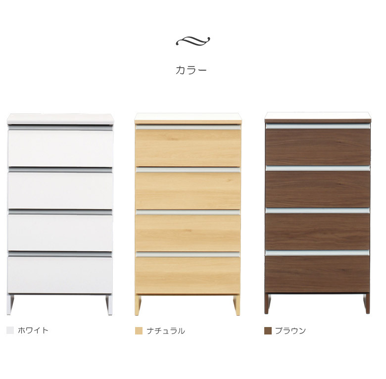 しっかりしたつくりの国産完成品。4段の引出しにたっぷり収納。出し入れスムーズなスライドレール仕様。木目の2色と艶の美しいホワイトの計3色から選べます。天板は水に強いつくり。