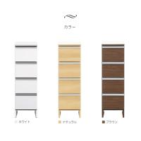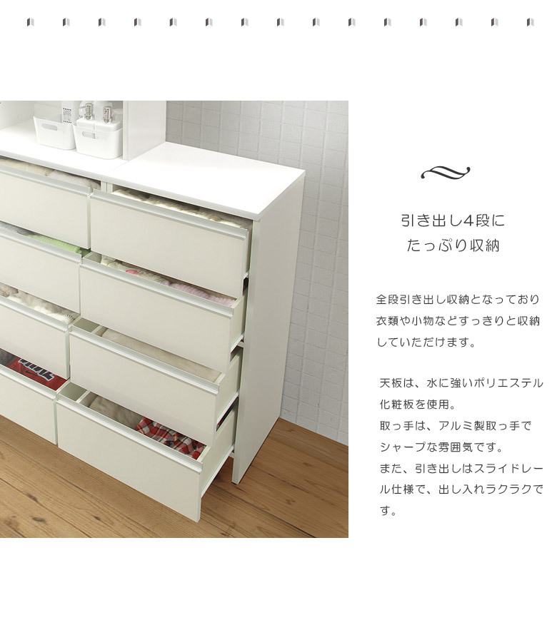 艶の美しいホワイトと木目の2色から選べるスリムですっきりとしたデザインのランドリー収納。引出し4段にすっきり収納可能。引き出しは出し入れスムーズなスライドレール仕様。