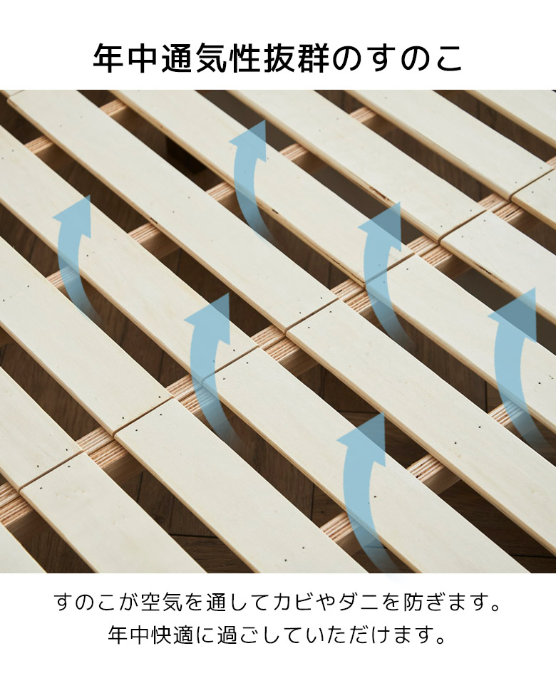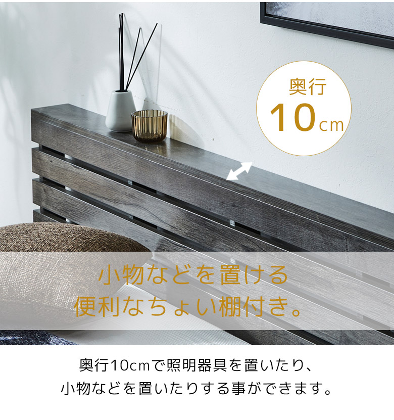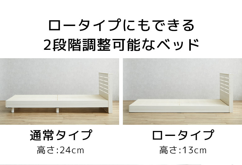 どんなインテリアにもなじんでリラックスできるくつろぎの時間を演出するベッドフレーム 脚は取り外し可能でロータイプにもできる2段階調整可能なベッド 小物を置けるちょい棚付き