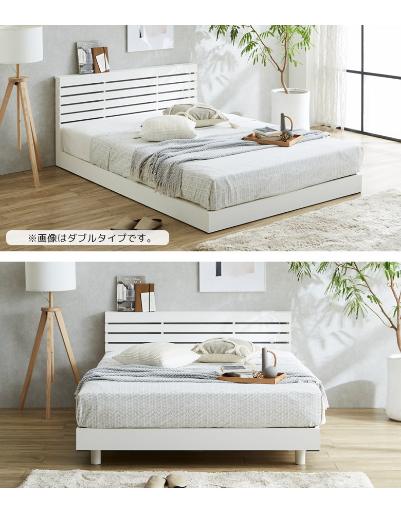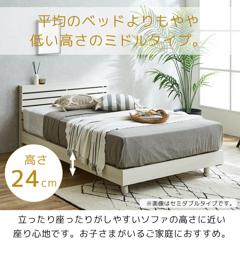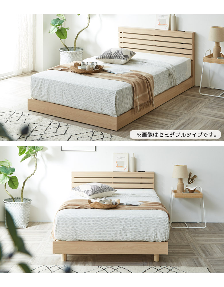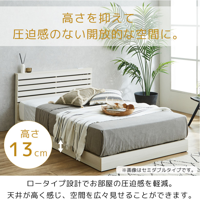 どんなインテリアにもなじんでリラックスできるくつろぎの時間を演出するベッドフレーム 脚は取り外し可能でロータイプにもできる2段階調整可能なベッド 小物を置けるちょい棚付き