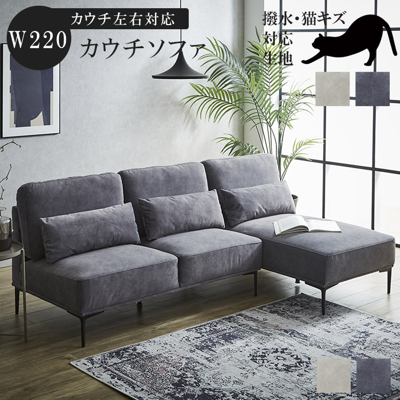 カウチソファ 3人掛け 幅220cm ソファ カウチ 左右入れ替え おしゃれ 背もたれ クッション 撥水加工 ファブリック 猫キズ ソファー クッション3個付き