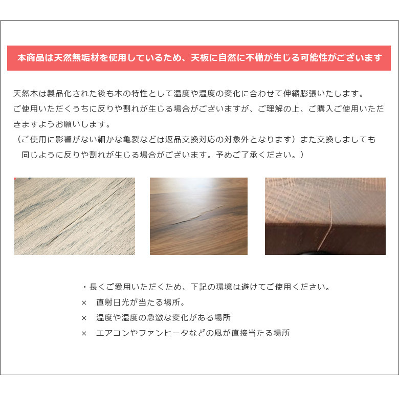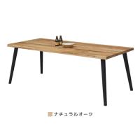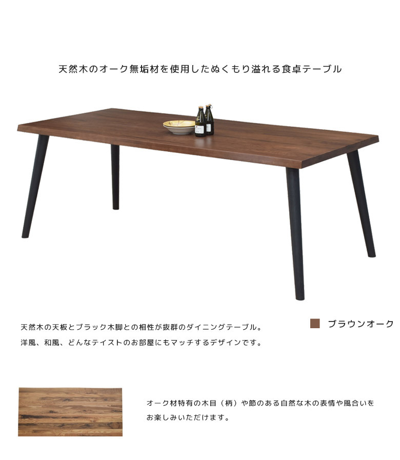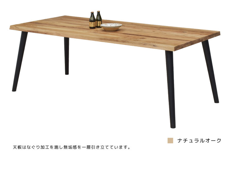 天然木の天板とブラックの木脚がマッチしたシンプルモダンなデザイン 無垢材の木目や節が引き立つなぐり加工が施された自然な風合いがお楽しみいただけるダイニングテーブル