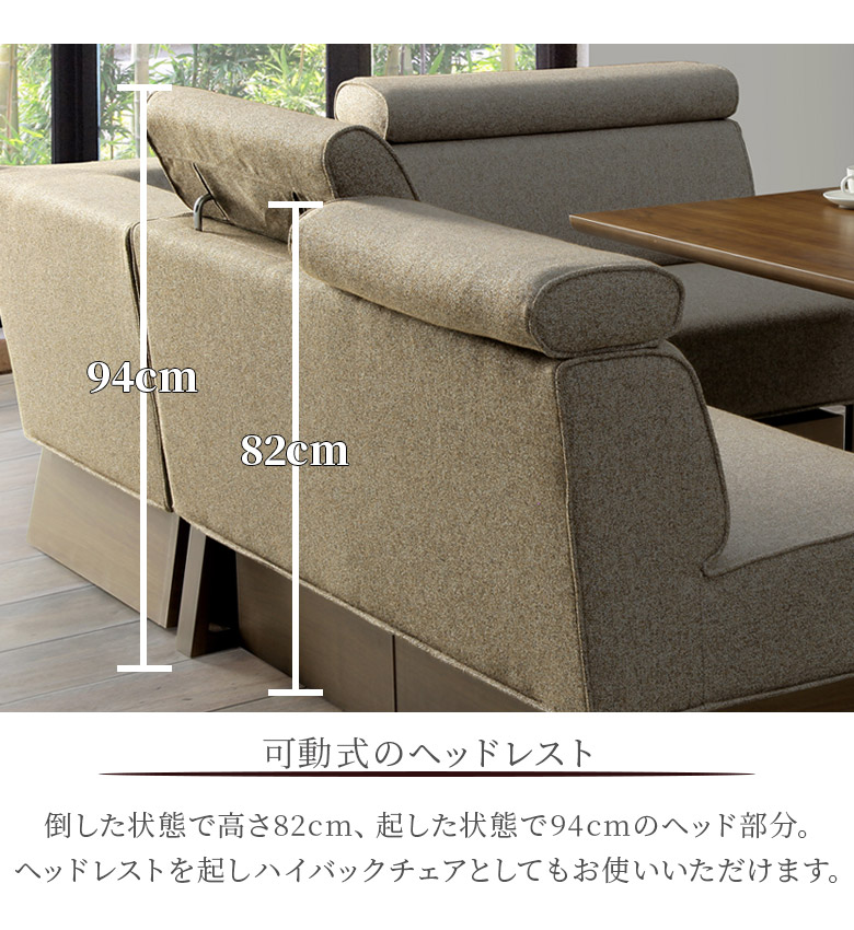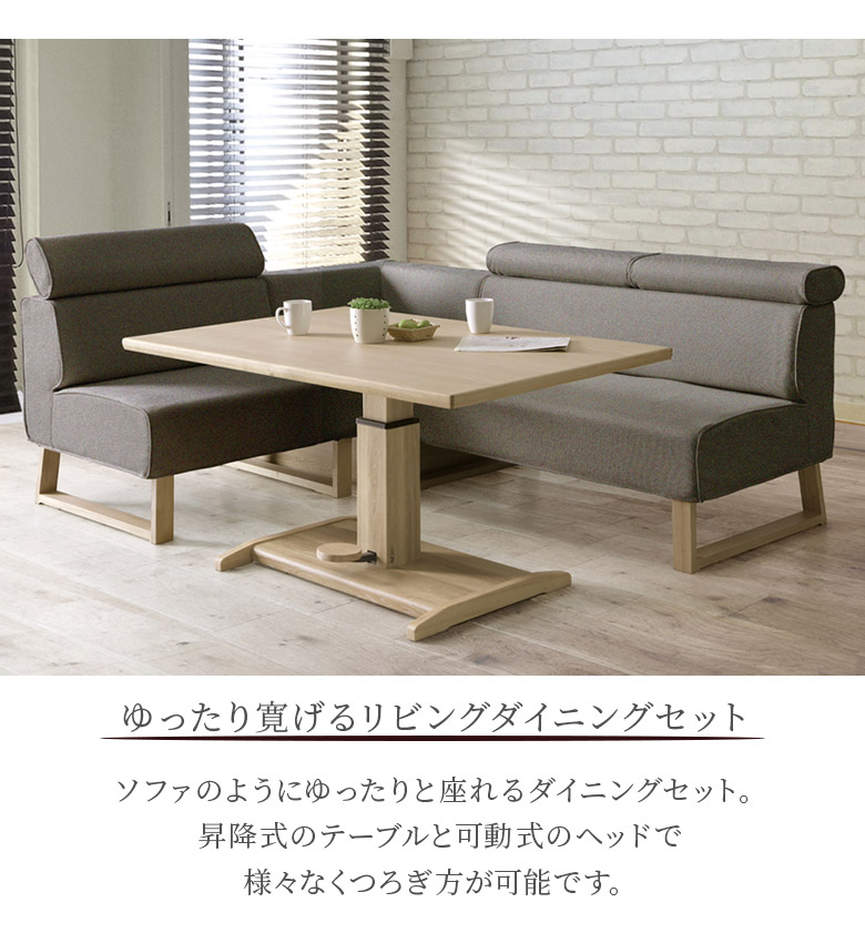 ゆったり寛げるリビングダイニング4点セット 昇降式のテーブルと可動式のヘッドで様々なくつろぎ方が可能 チェアの張地は撥水加工で取り外して洗濯可能