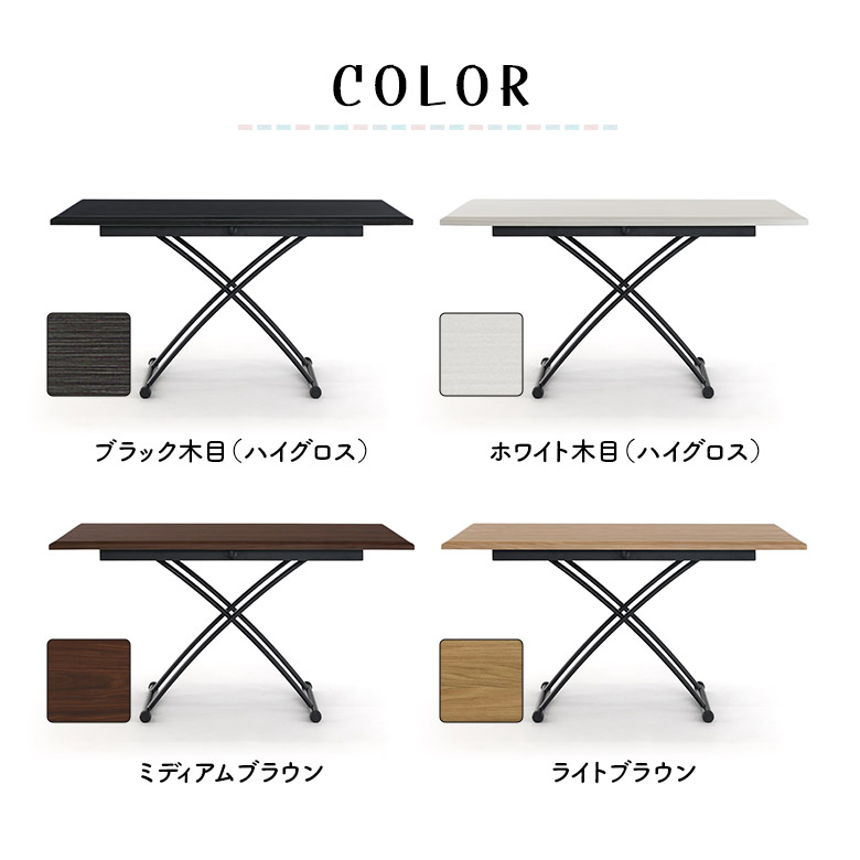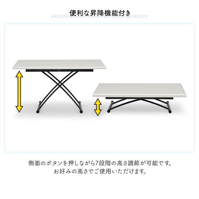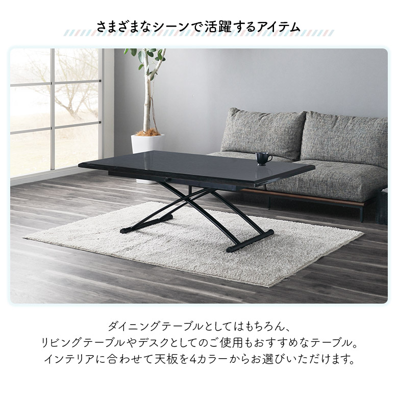 ダイニングテーブルとしてはもちろん、リビングテーブルやデスクとしてのご使用もおすすめの昇降式テーブルです。