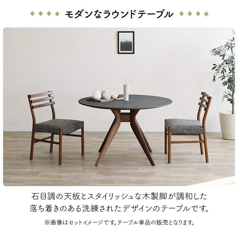 石目調の天板とスタイリッシュな木脚が調和した洗練されたデザインのテーブル。