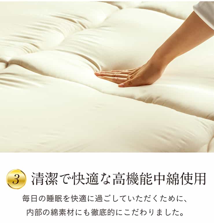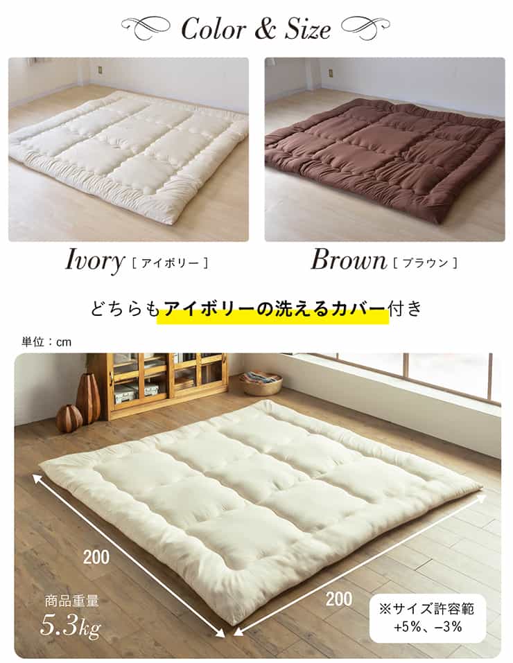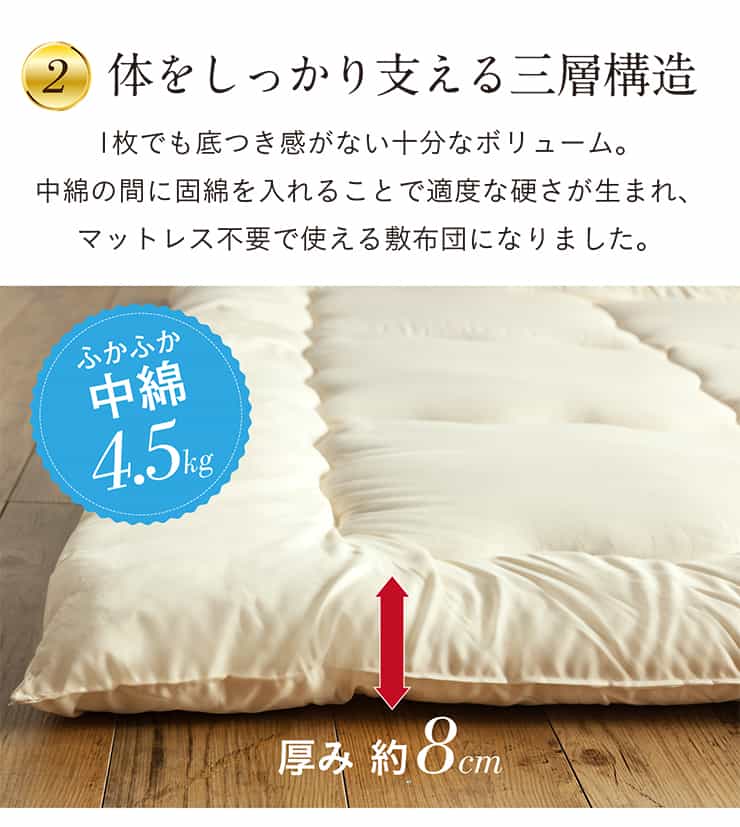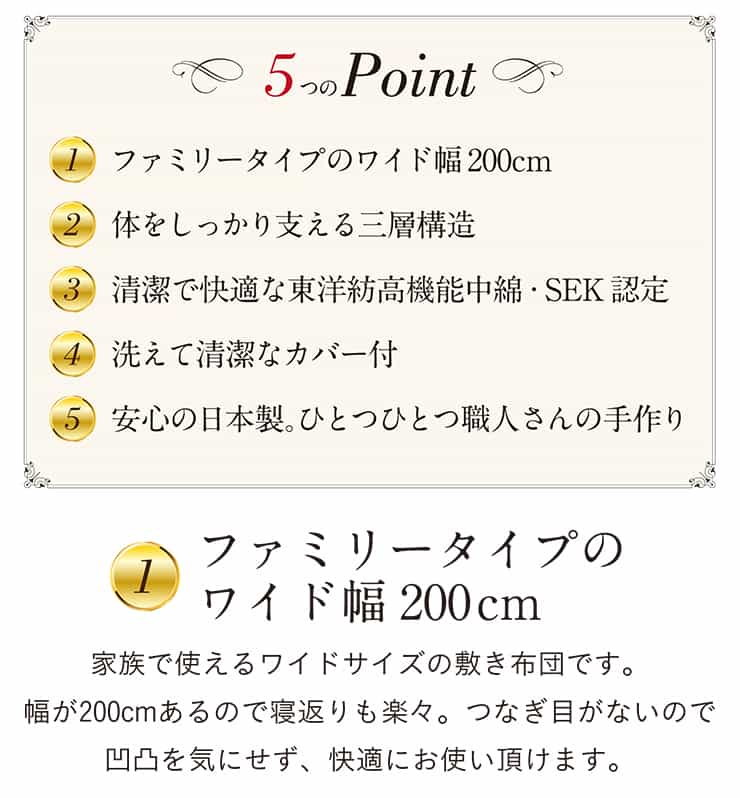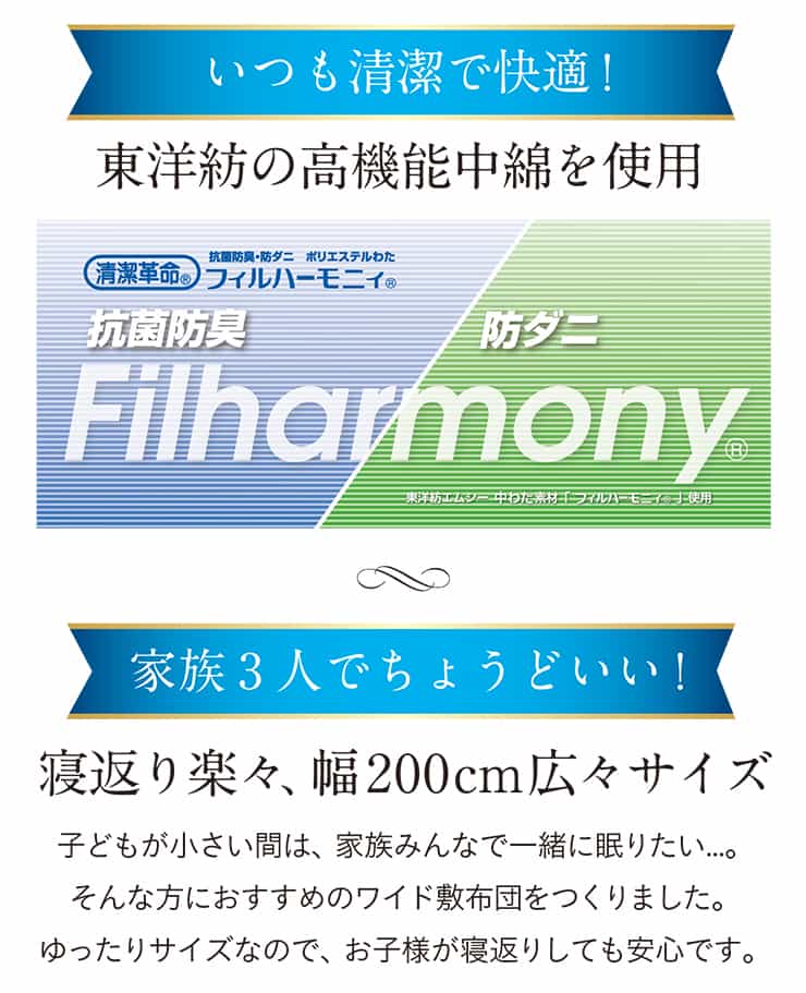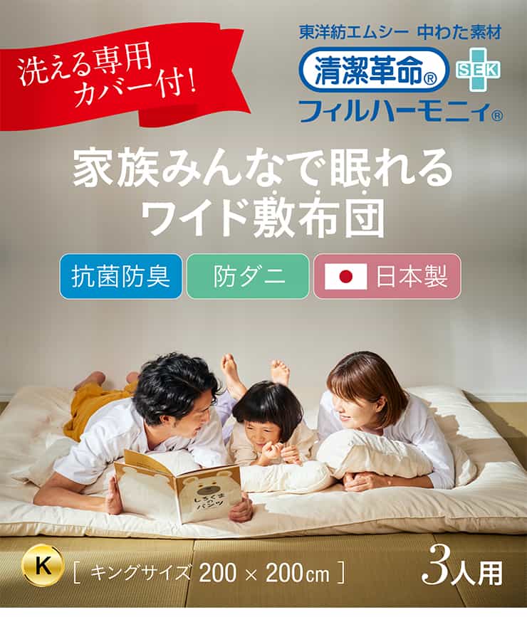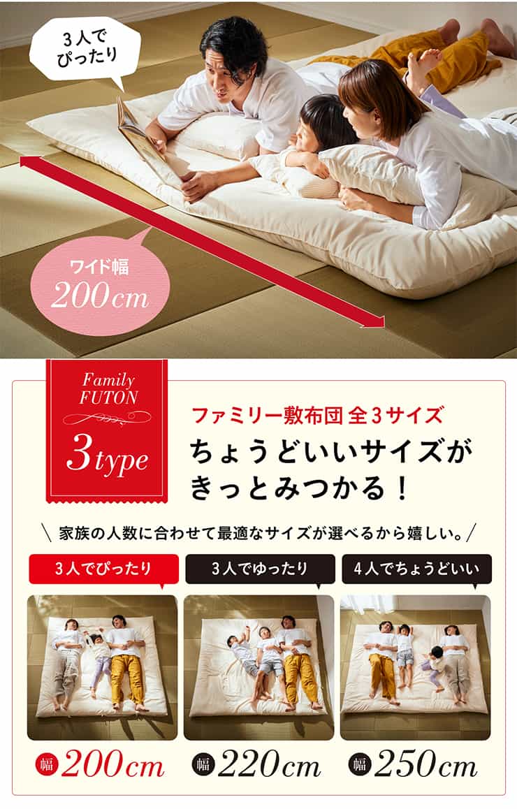 いつも清潔で快適、家族3人でちょうどいい寝返り楽々の幅200cm広々ワイド敷布団。