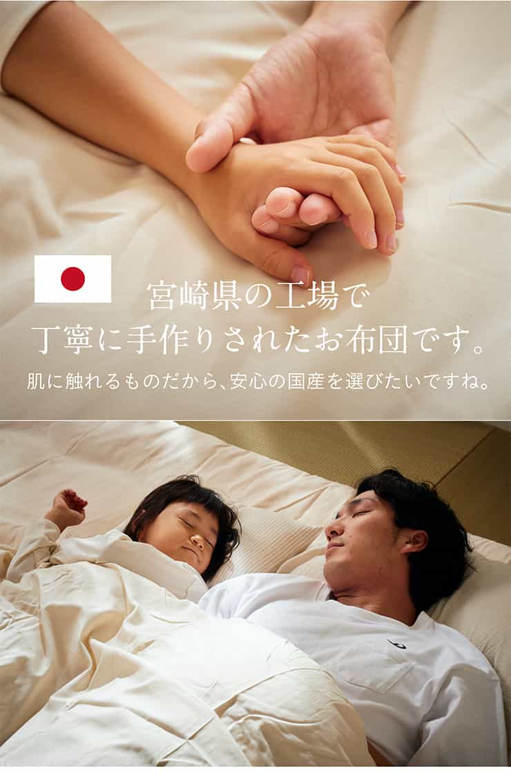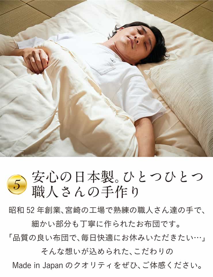 昭和52年創業、宮崎の工場で熟練の職人さんたちの手により、細かい部分も丁寧に作られた羽毛布団です。