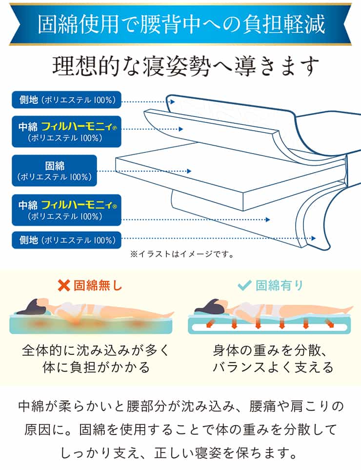 敷布団の中綿は、抗菌防臭、防ダニの効果のある東洋紡フィルハーモニイを使用。
